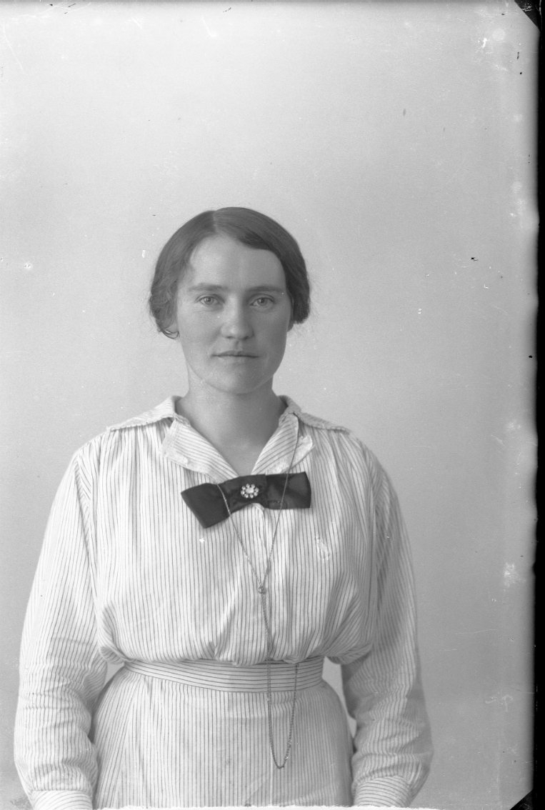 Porträtt av en kvinna i ljus smalrandig klänning. Rosett på bröstet och halsband.