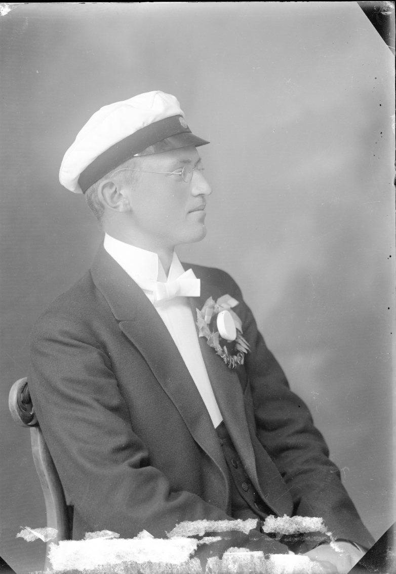 Porträtt av en sittande manlig student med glasögon, i profil.