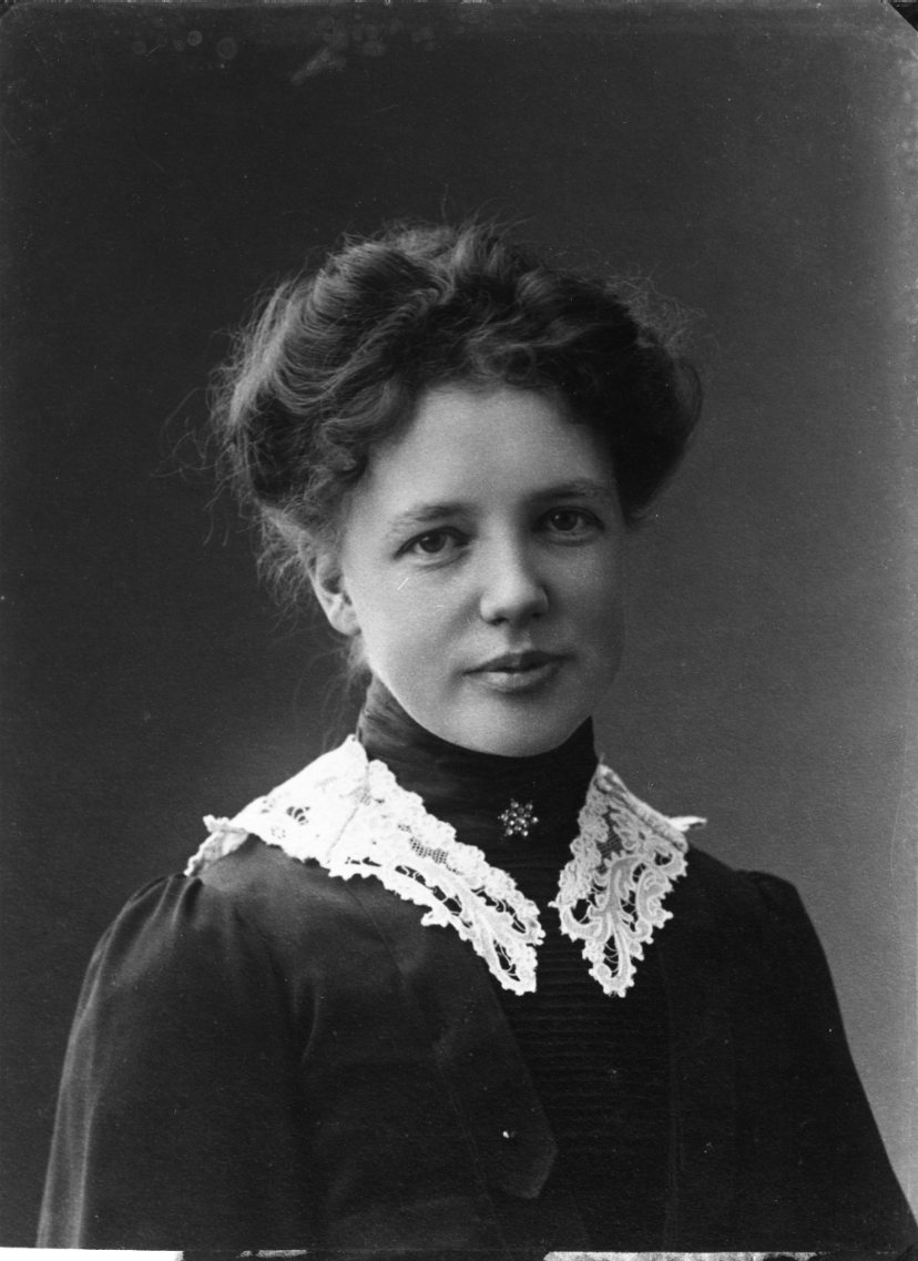 Porträtt av en okänd kvinna, vit virkad krage mot mörk botten, bröstbild.