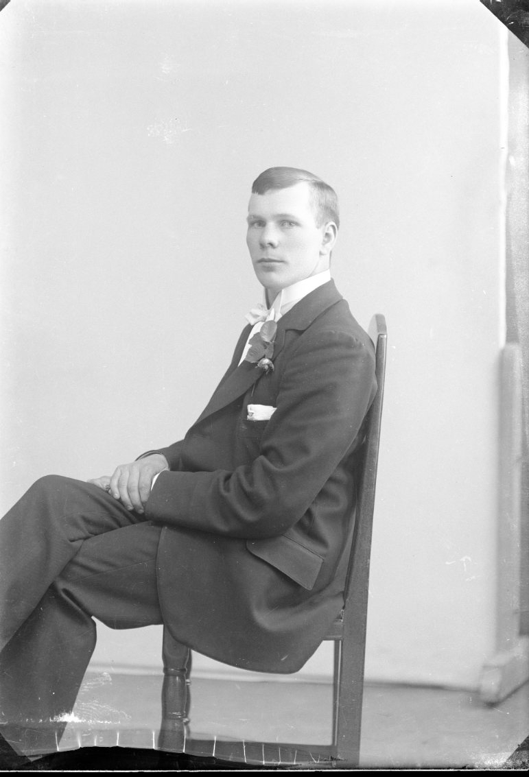Porträtt av en ung man som sitter på en stol i profil, men tittar mot fotografen.