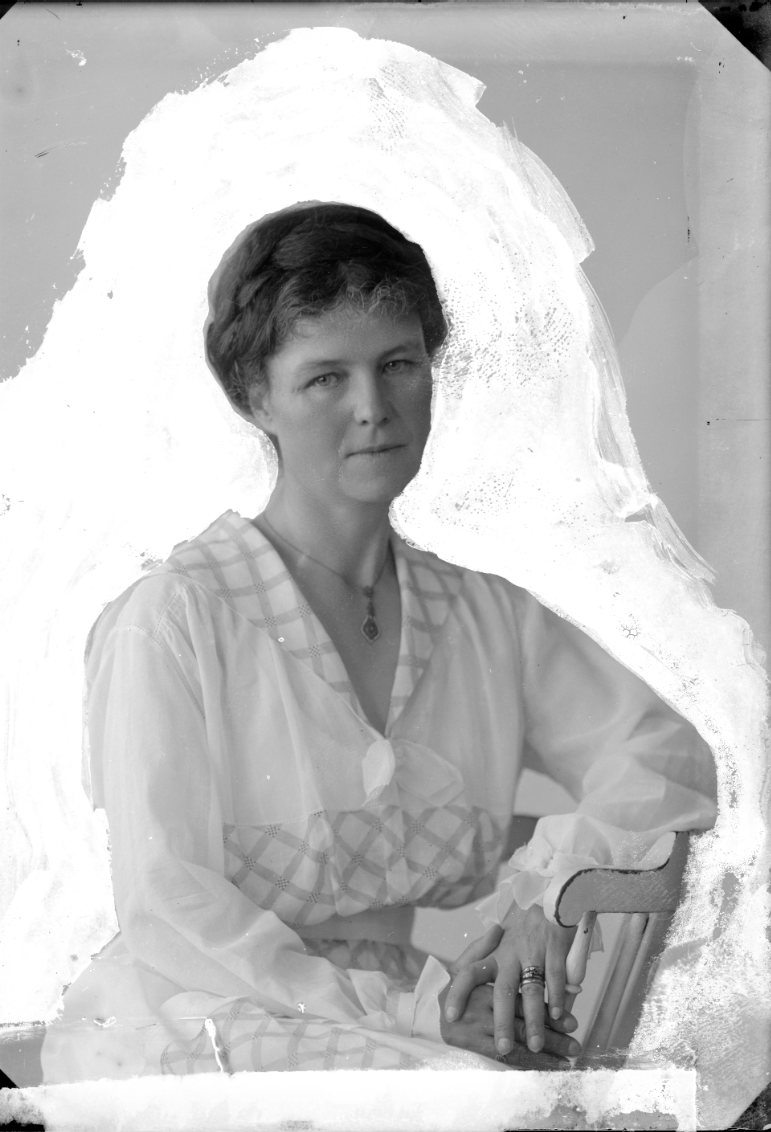 Porträtt av en kvinna i ljus delvis rutig klänning, hon bär ett halssmycke. Hon sitter på en stol.
