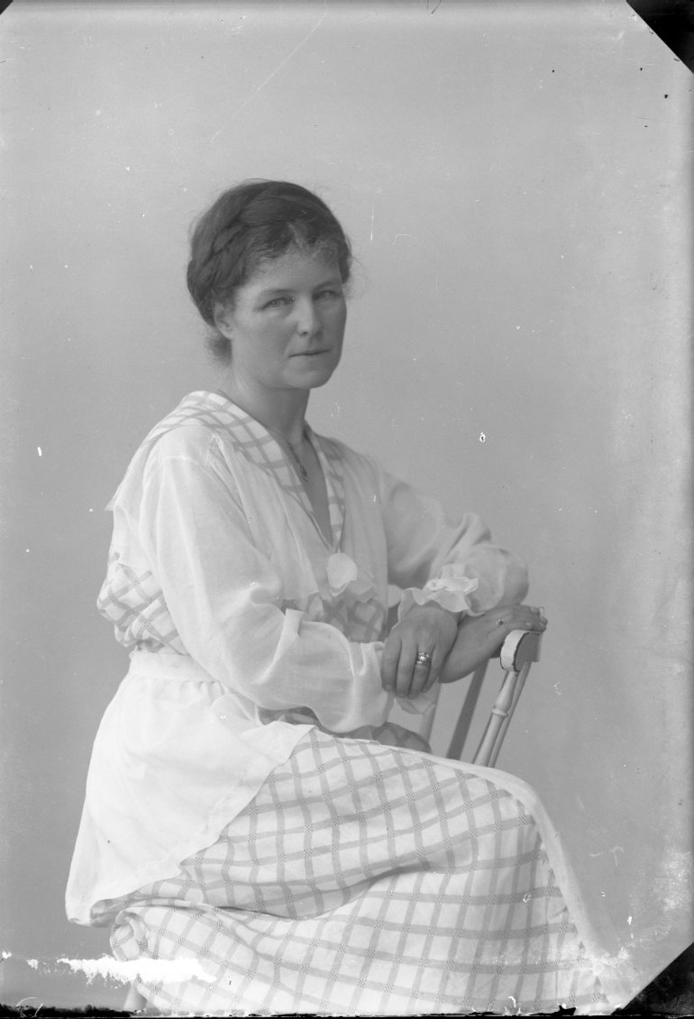 Porträtt av en kvinna i ljus delvis rutig klänning, hon bär ett halssmycke. Hon sitter på en stol.