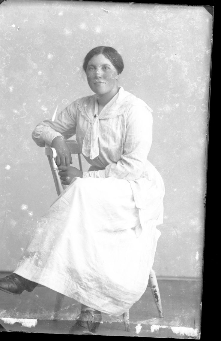 Titel: Porträtt av en ung kvinna i vit klänning som sitter på en stol.