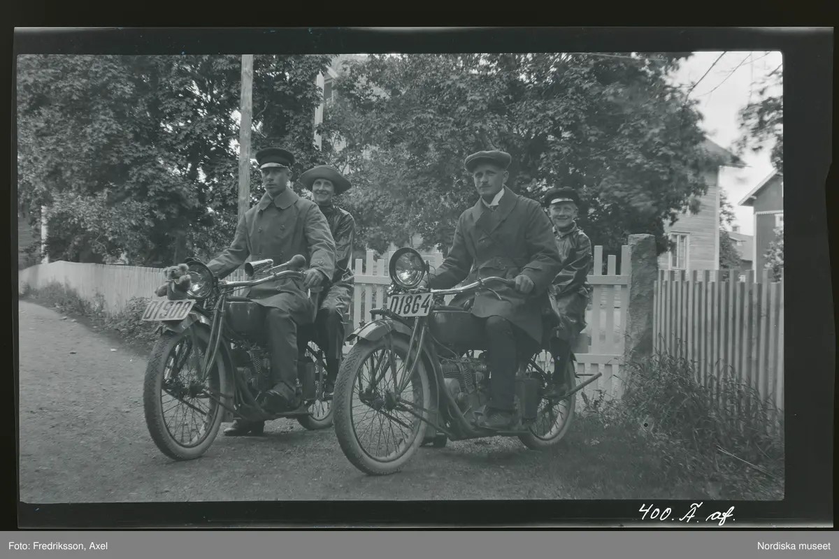 "Axel, Nils och Elsa Råstedt på motorcykeltripp, foto 1921."