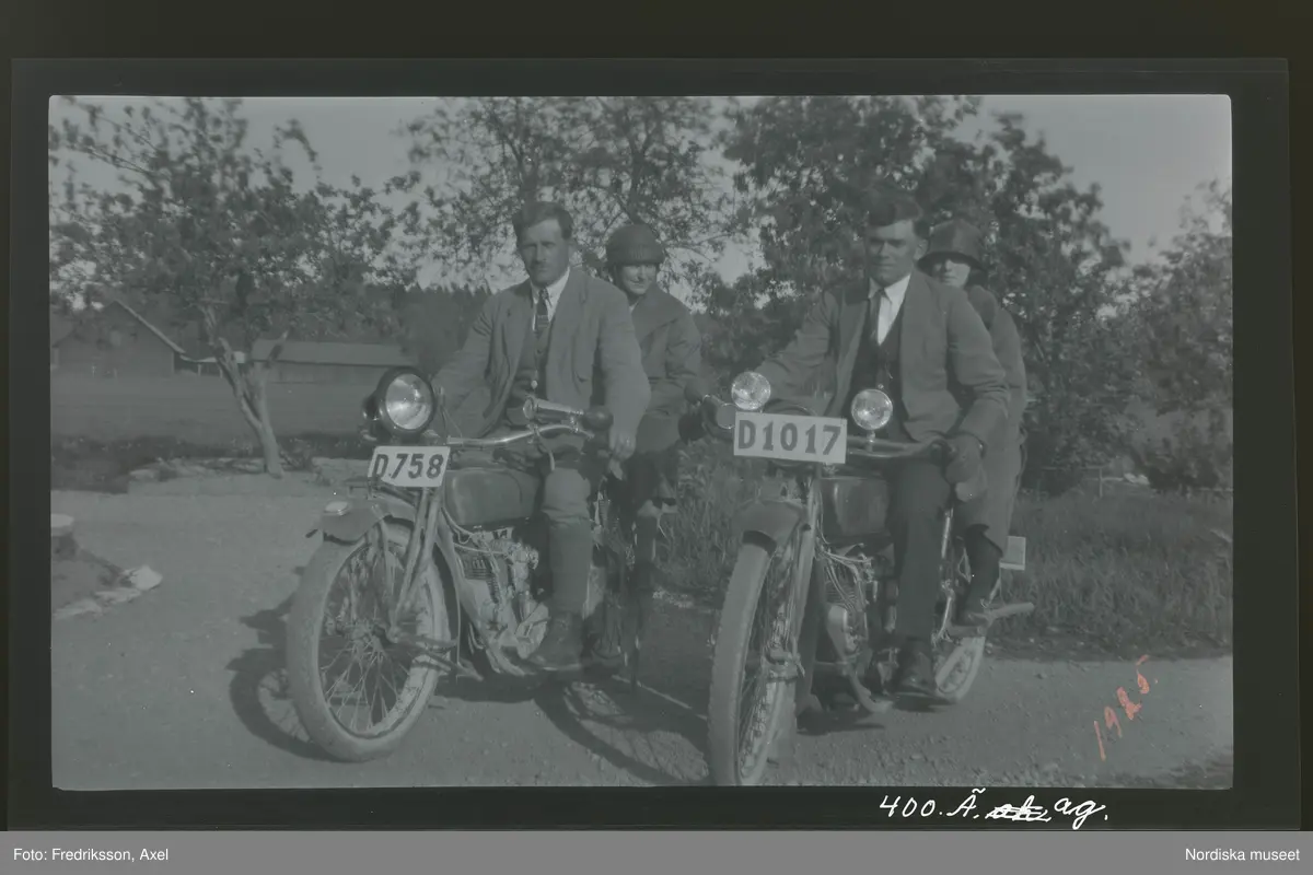 Två män på moped/ motorcykel. båda skjutsar varsin kvinna. Makarna Axel och Frida Fredriksson till vänster.