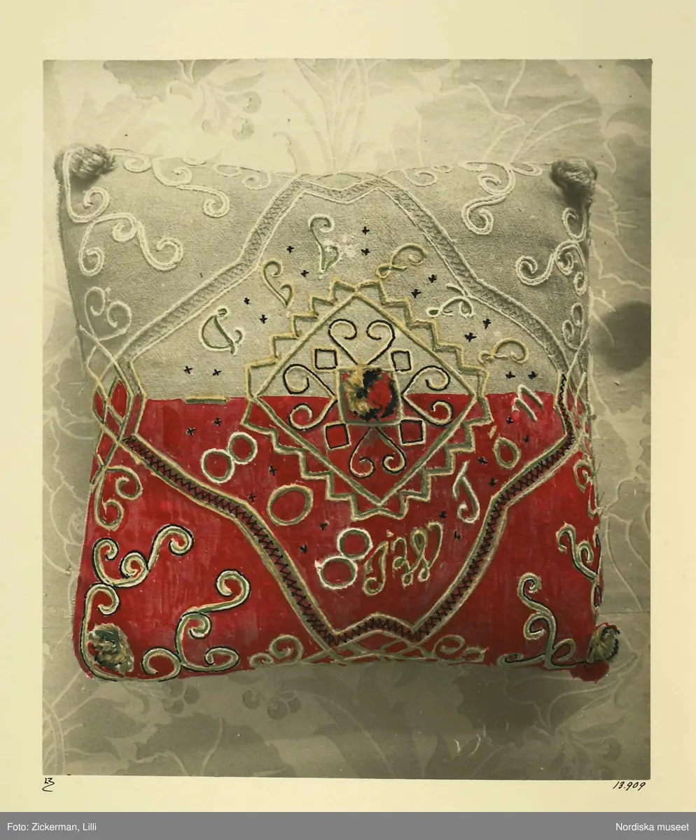 Kudde, Värmland, nr 13909. Fotografi av kudde, handkolorerad till hälften för att visa färgerna i garnet. Ingår i Lilli Zickermans samling "Samlingsverk över Svenska Allmogetextilier" .