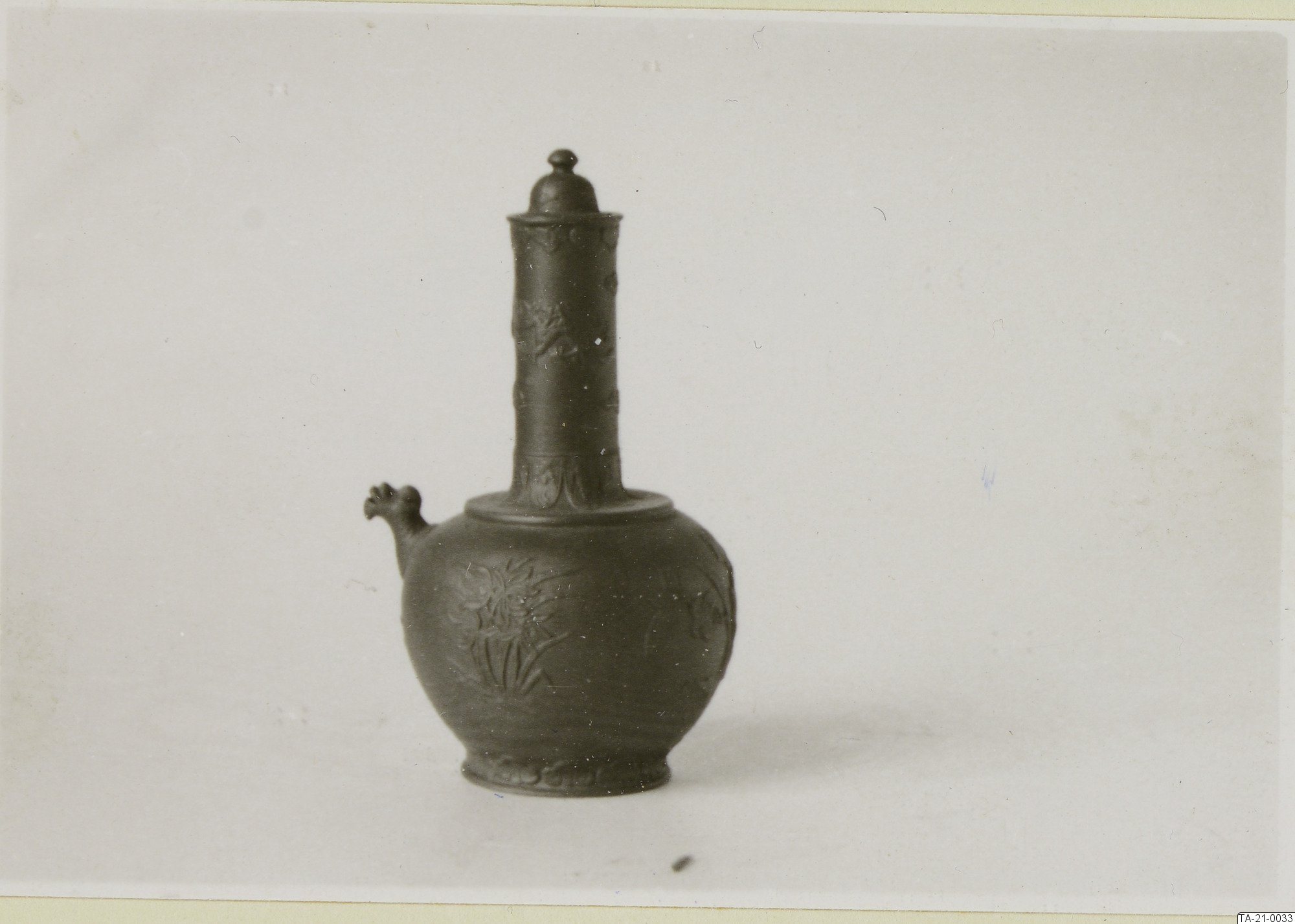 Flaska av oglacerat brunt stengods...växt och drakmönster i relief. Kina 1700-tal. Buccaro