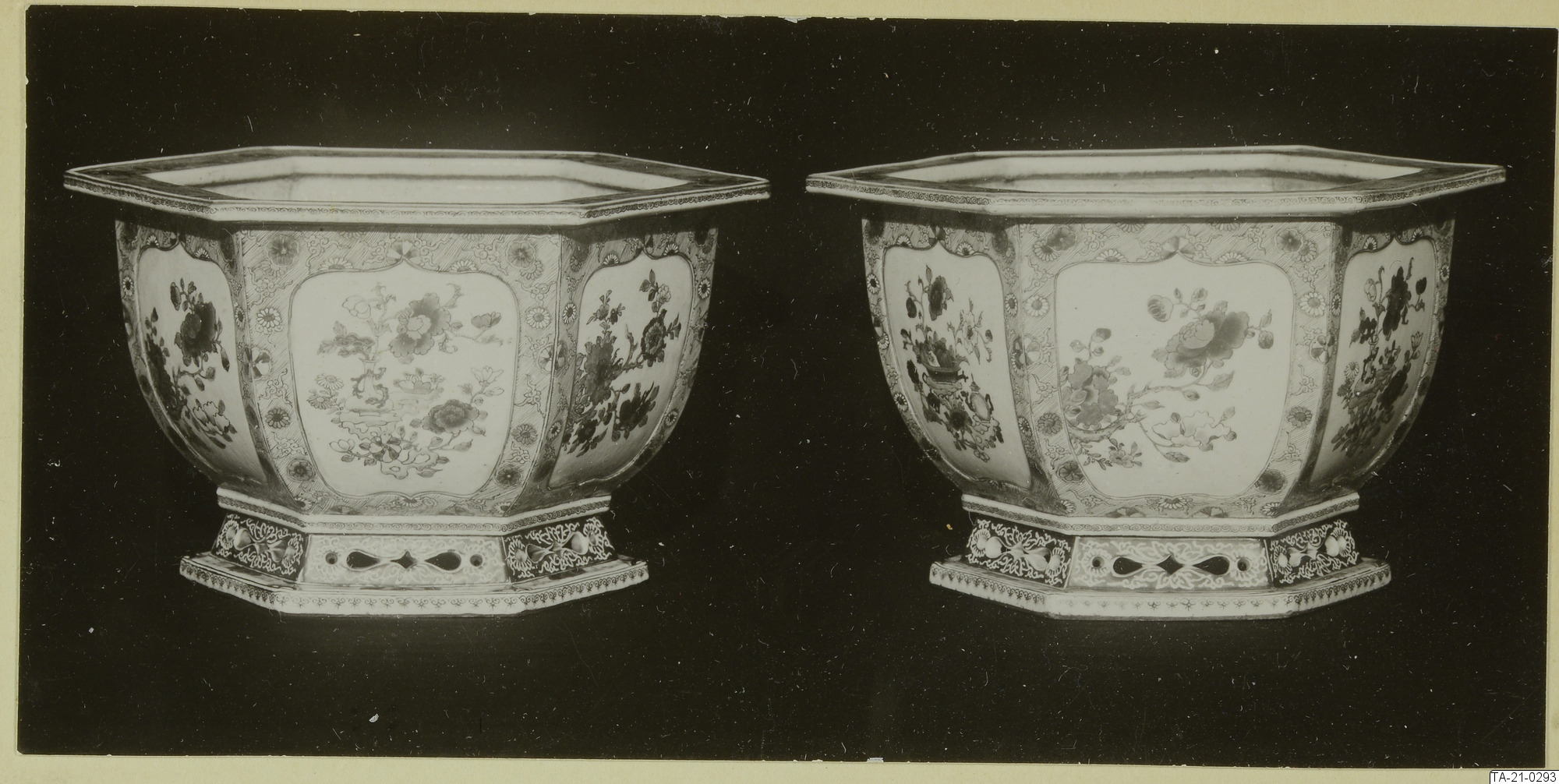 Två blomkrukor (blomkruka), blåvitt, Kina, porslin. Guld- och emaljfärger. Deposition 1933, Länsresidenset, Linköping (Linköping slott).