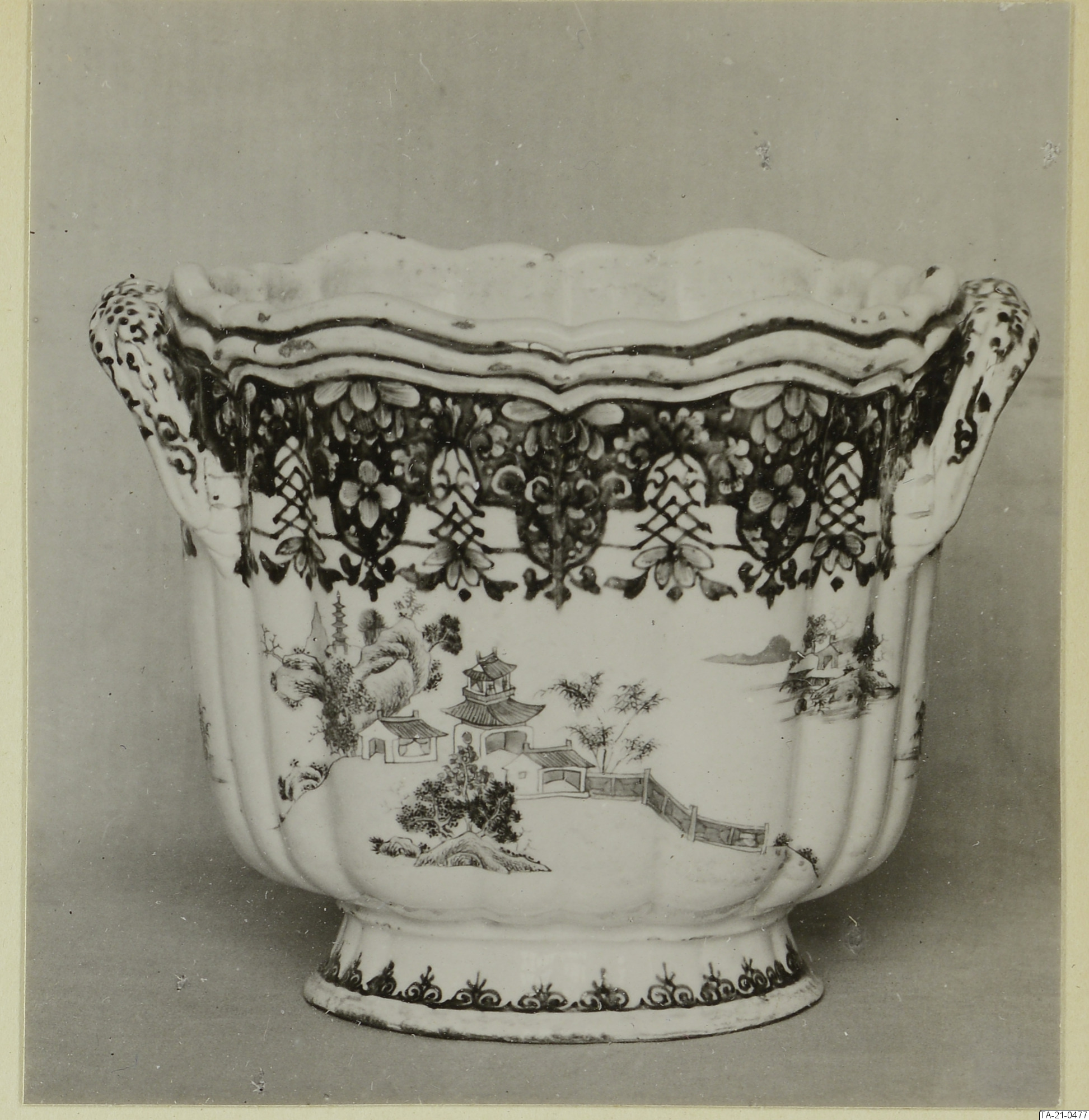 Två blomkrukor, Famille rose, underglasyrblått, blåvitt, Kina, 1700-tal, deposition 1931 i Överståthållarepalatset (Tessinska, "Överståthållarpalatset")