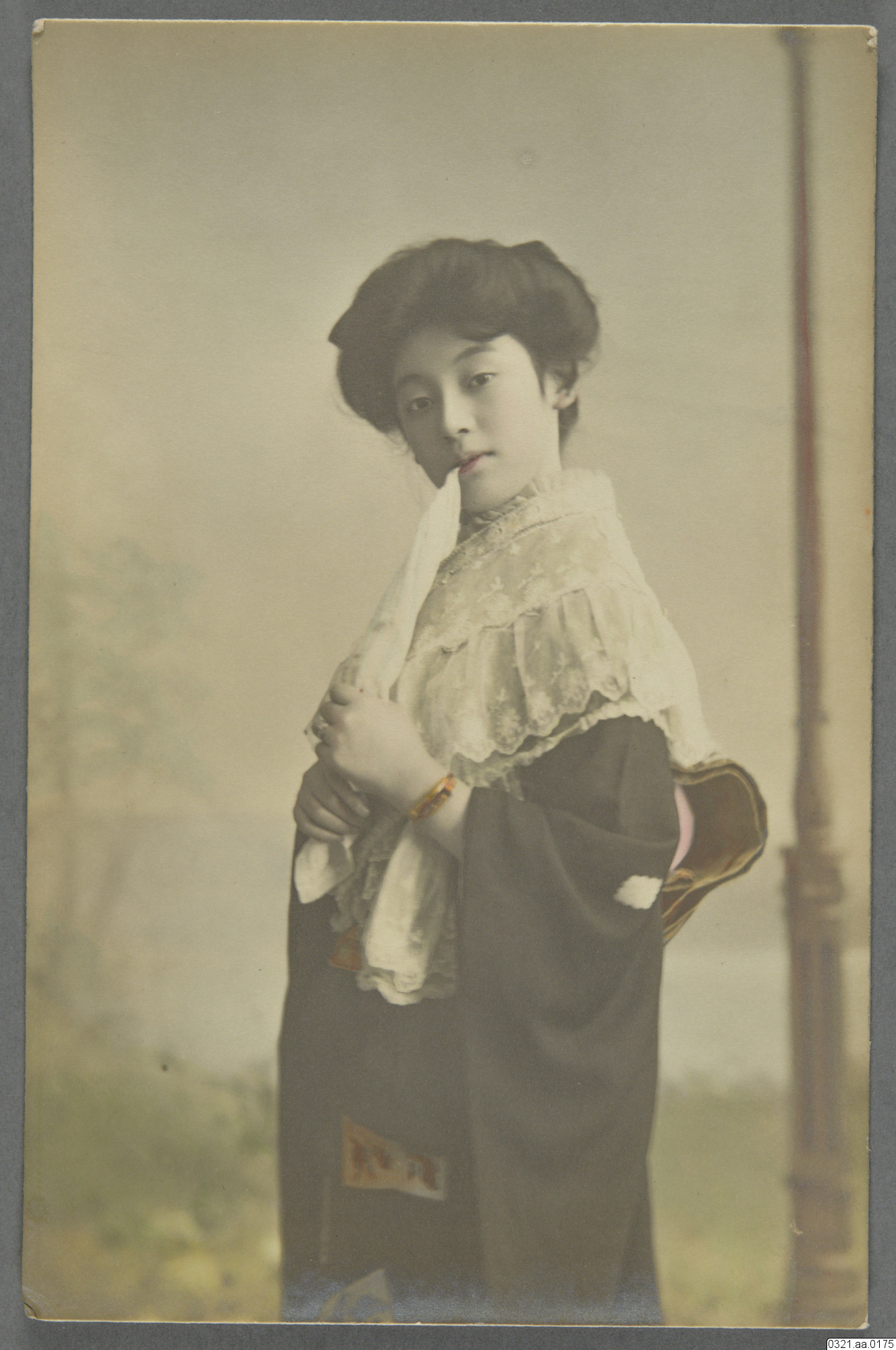 Kolorerat vykort, porträtt av geisha, stående med näsduk/servett i mungipan, Post Card, Sakaeya & Co. Kobe