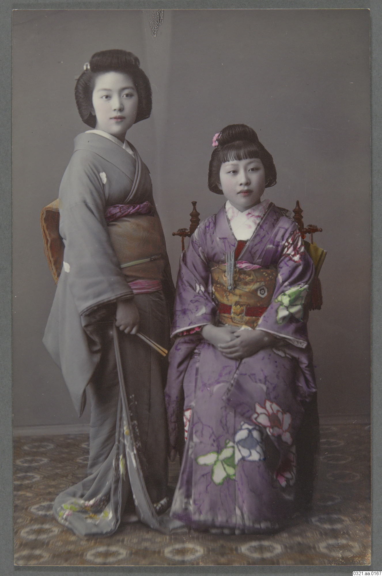 Kolorerat vykort, porträtt av två geishor, Carte Postale, Trade Mark, S.M