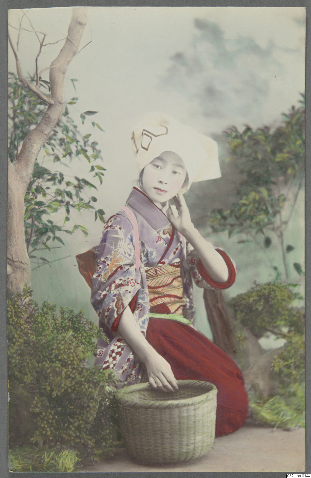 Kolorerat vykort, porträtt av geisha,sittande med korg invid, kuliss av landskap, Union Postale Universelle, Carte Postale