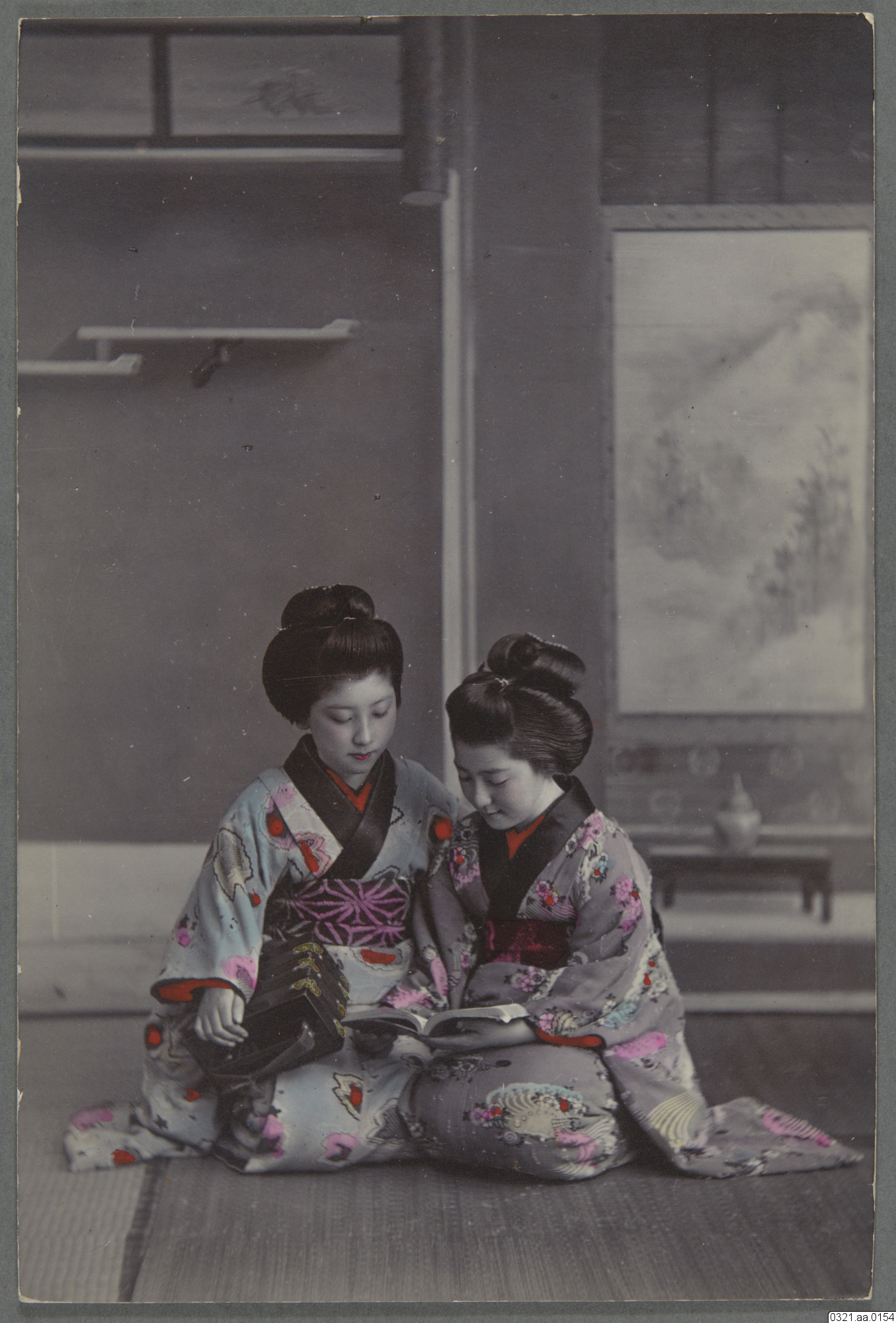 Kolorerat vykort, porträtt av två geishor, sittande på golv med dragspel och bok, Post Card