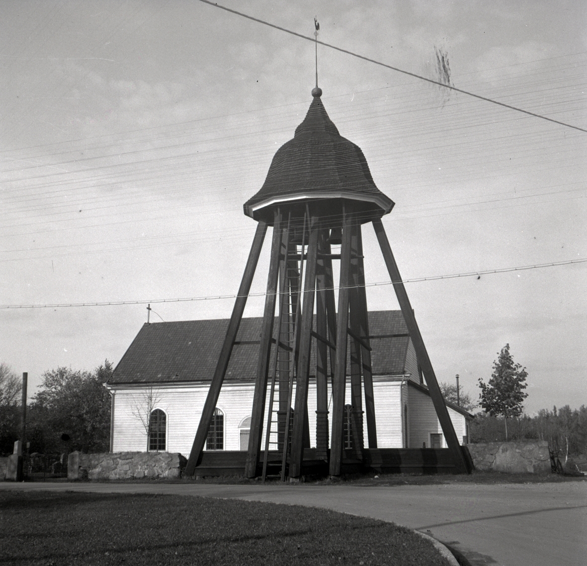 Karlslunda kyrka. Kyrka och klockstapel med formen av en klocka i.