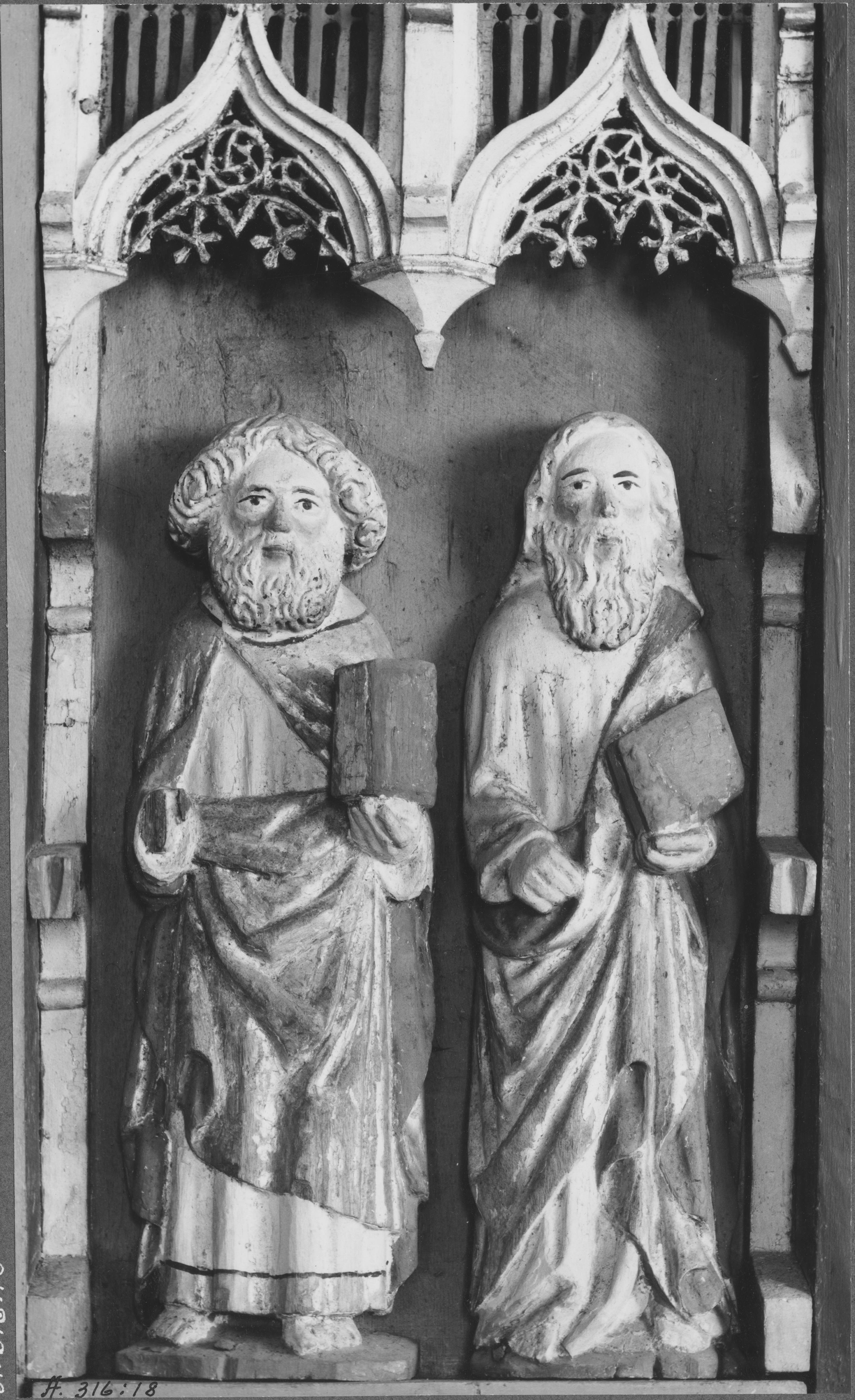 Beskrivning: Altarskåp av trä med två flygeldörrar. Snidade, krederade och målade figurer. Detalj, högra flygeln. Svenskt eller nordtyskt arbete från omkring 1500.