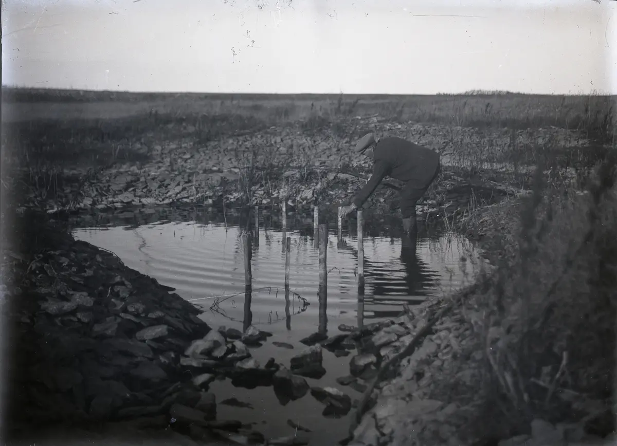 En del i beredningsprocessen var rötningen. Botels Lars Hansson slår ner pinnarna för att linknippena inte skall flyta iväg, troligen i en av vattenhålen vid Lunds vät på Lausbackar omkring 250 m öster om Bjärges norra part.