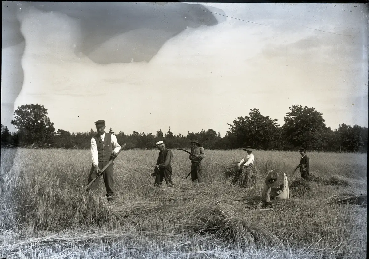 Masse har nog kommit överens i förväg om att komma och ta bilder, för folket på Kuse är rätt finklädda. Nu är det här inte ett så smutsigt arbete som mycket annat, men hattar och ljusa kläder tyder på lite högtid. Den tredje mannen bryner upp sigden, bladet, på lien, med sitt sigdspån. Sigdspånet fäste man på örvet, liensskaft, så man alltid hade det till hands.