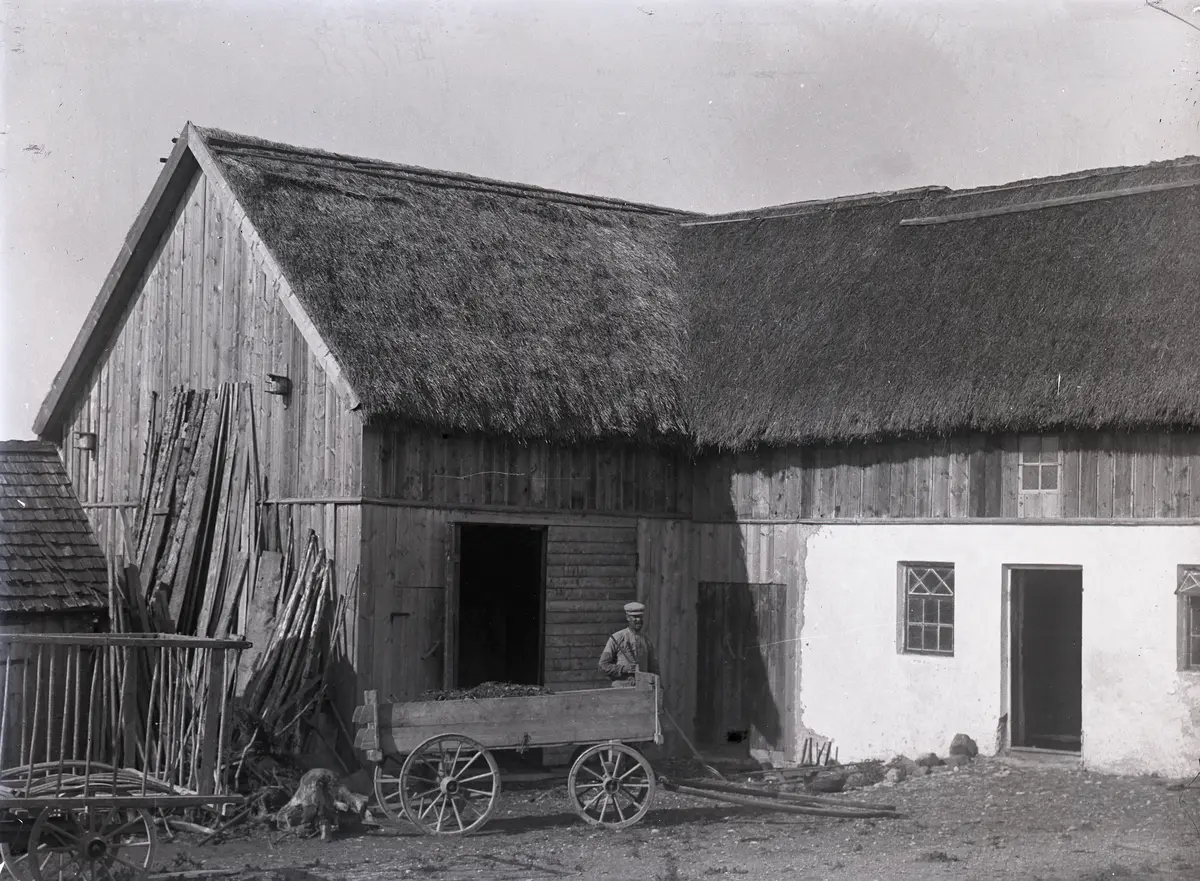 Ladugården är ovanligt stor för att vara på en så pass liten gård. Längst till vänster är det nog lada, sedan i stendelen följer två kohus och stall, längst t h har det kanske varit gris- och lammhus. De högra 2/3(?) av stendelen finns kvar idag.