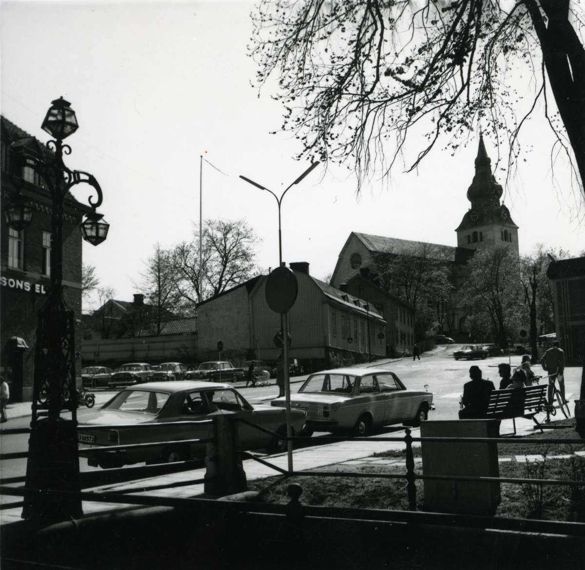Vy över kvarteret Prästgården och bortanför det kvarteret Kyrkbacken 2, sett från kanalen. Närmast står två bilar parkerade och några människor sitter på en parkbänk till höger. Till vänster en gatubelysning med tre lyktor. I bakgrunden syns kyrkan.
