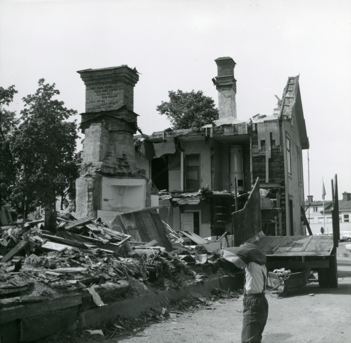 Klockargården i kvarteret Kyrkbacken 2, Hudiksvall, under rivning. Sett från Repslagargatan. En stor vagn står parkerad invid rivningshuset och en man står i förgrunden.