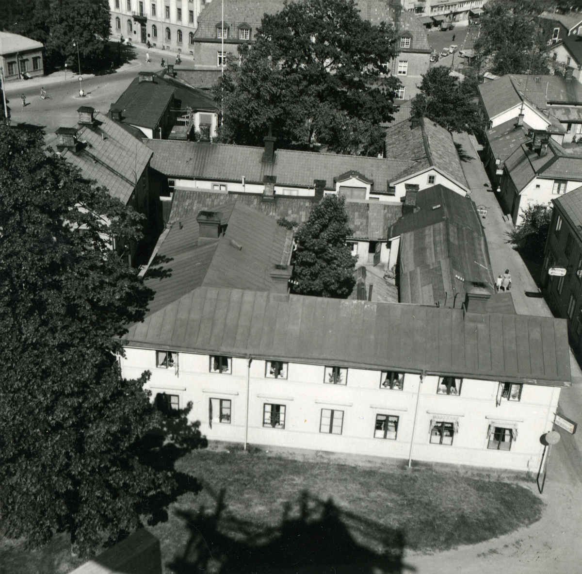 Utsikt från kyrkans östra gavelröste, kvarteret Kyrkbacken, Hudiksvall. I förgrunden syns långsidan på en huskropp med fjorton fönster. I mitten syns en innergård med ett träd. I bakgrunden anas Sundsvalls bank och Sparbankshuset. Till höger Lilla Kyrkogatan.