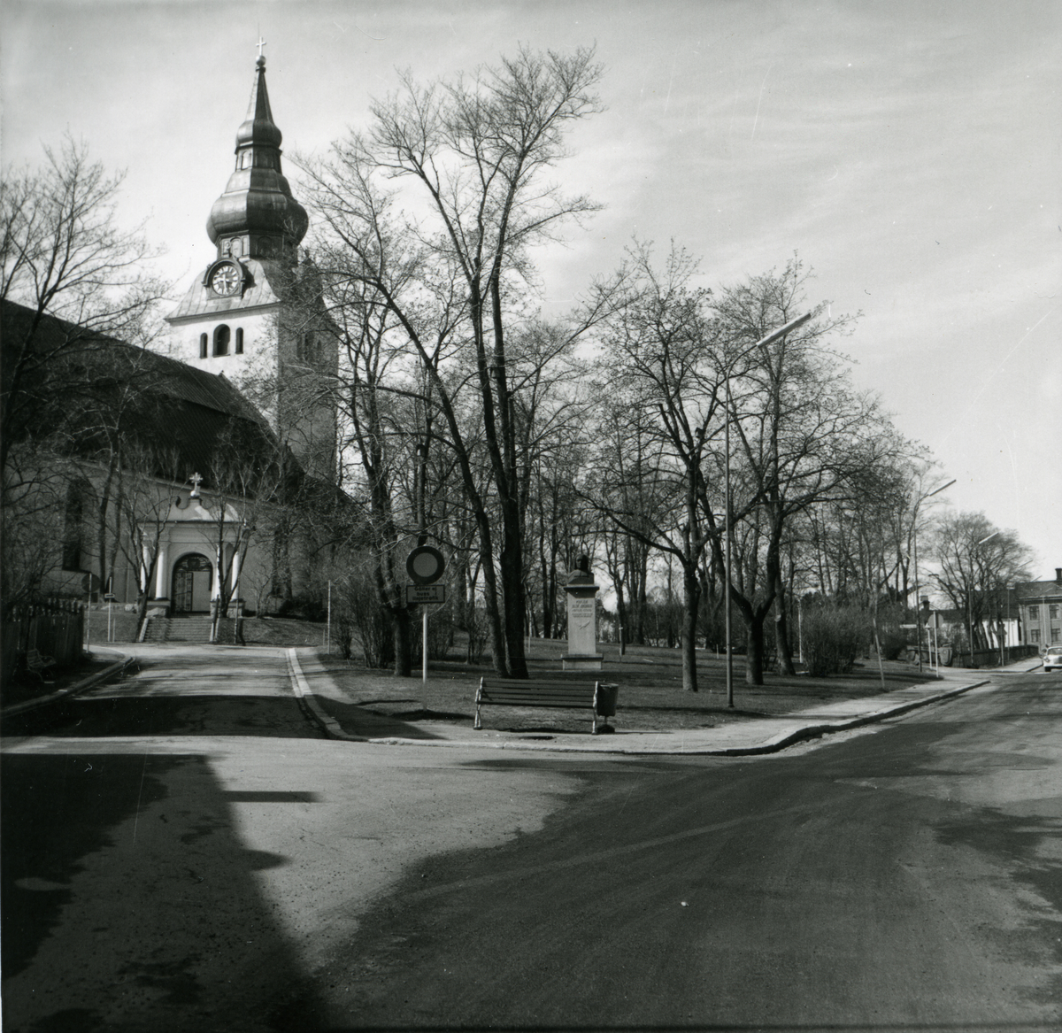 Kyrkan och Olof Bromans byst, Bromansparken, Hudiksvall. Till vänster syns en kyrkportal. Närmast i bild står en parkbänk.