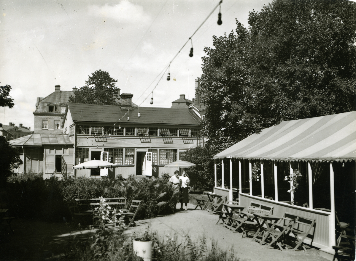 Café Centralparken i kvarteret Köpmannen, Hudiksvall, på 30-talet. Rakt fram syns byggnaden med många små fönster, några är öppna. Två kvinnor står invid paviljongen med randig markis och blomsteramplar. Trädgårdsmöbler och parasoller syns på gården, samt hängande lampor/lyktor.