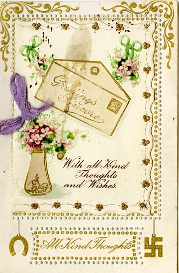 Notering på kortet: Greetings Sincere. Wilh all Kind Thoughts and Wishes. All kind Thoughts.