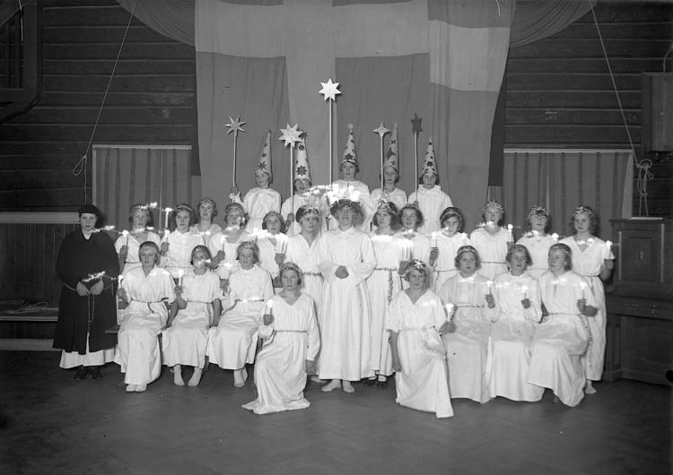 "Lucia omgiven av tärnor och några stjärngossar. Samlingssal" lyder bildtexten.