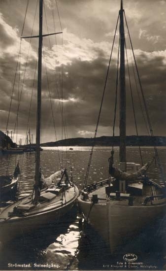 Tryckt text på kortet: "Strömstad. Solnedgång."