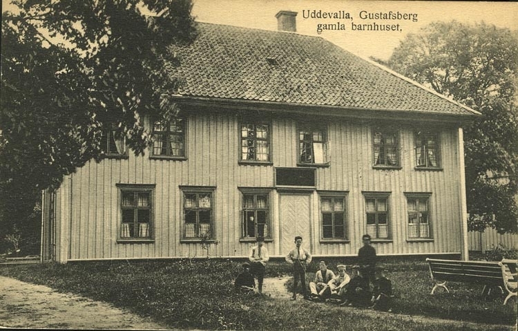 Tryckt text på vykortets framsida: "Uddevalla, Gustafsberg." "gamla barnhuset."