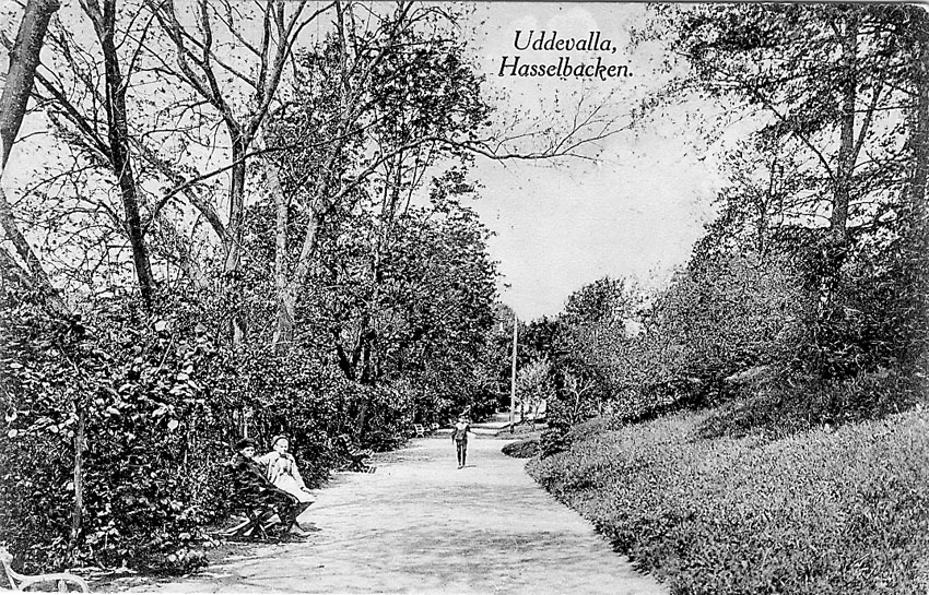 Tryckt text på vykortets framsida: "Uddevalla. Hasselbacken".