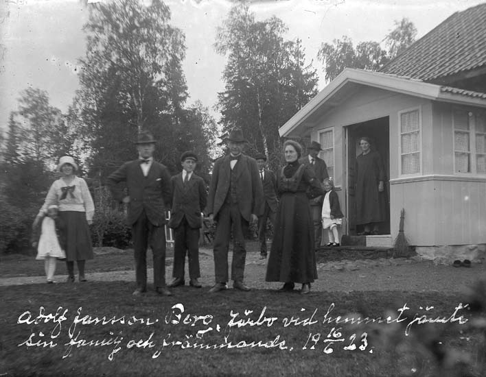 "Adolf Jansson, Berg, Järbo vid hemmet jämte sin familj och främmande 1923-06-16. antecknat på fotografiet med vit färg