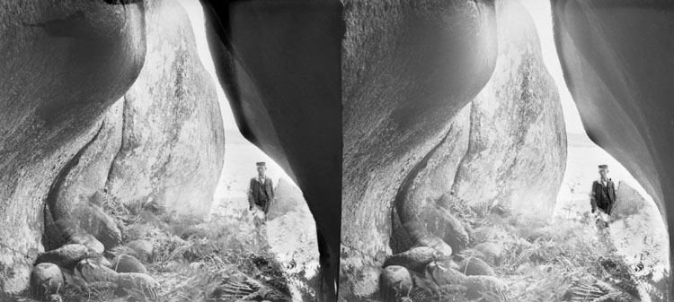 (Stereo karta VI) 19 Juli 1905 Tjuf Halvors håla inifrån, pojken står.
