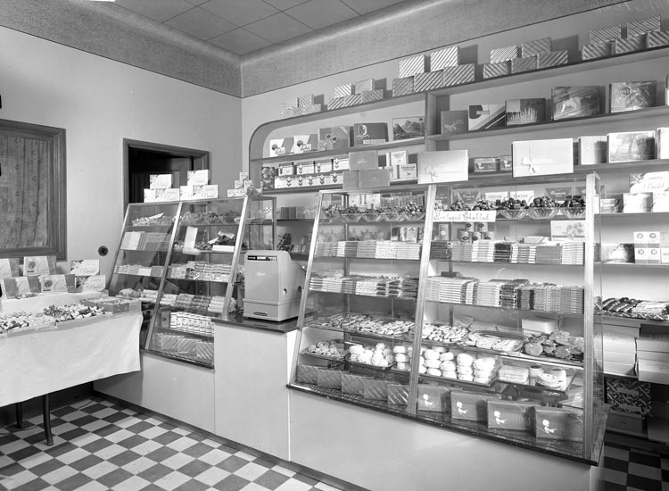 Uppgift enligt fotografen: "Uddevalla. Interiör. Konfektyraffären Wieval."
