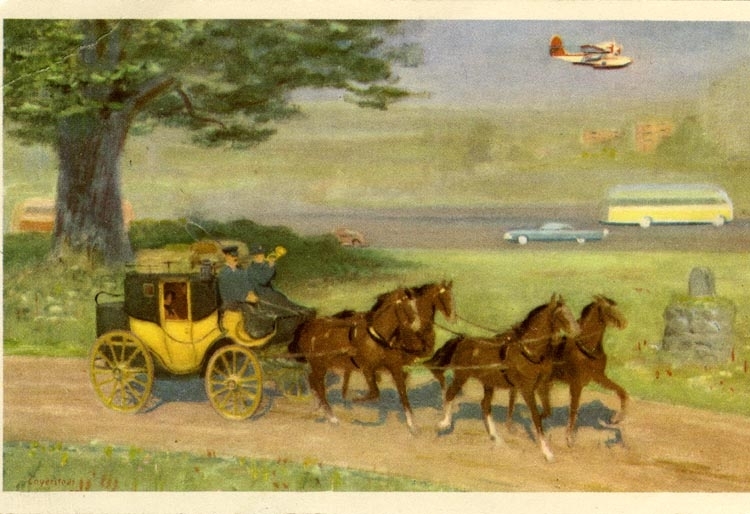 Notering på kortet: Aftonbladet var den första tidningen, som utnyttjade den av Kungl. Postverket år 1830 upprättade diligenslinjen Stockholm-Ystad för den efter dåtida begrepp snabbare och mest effektiva distributionen.