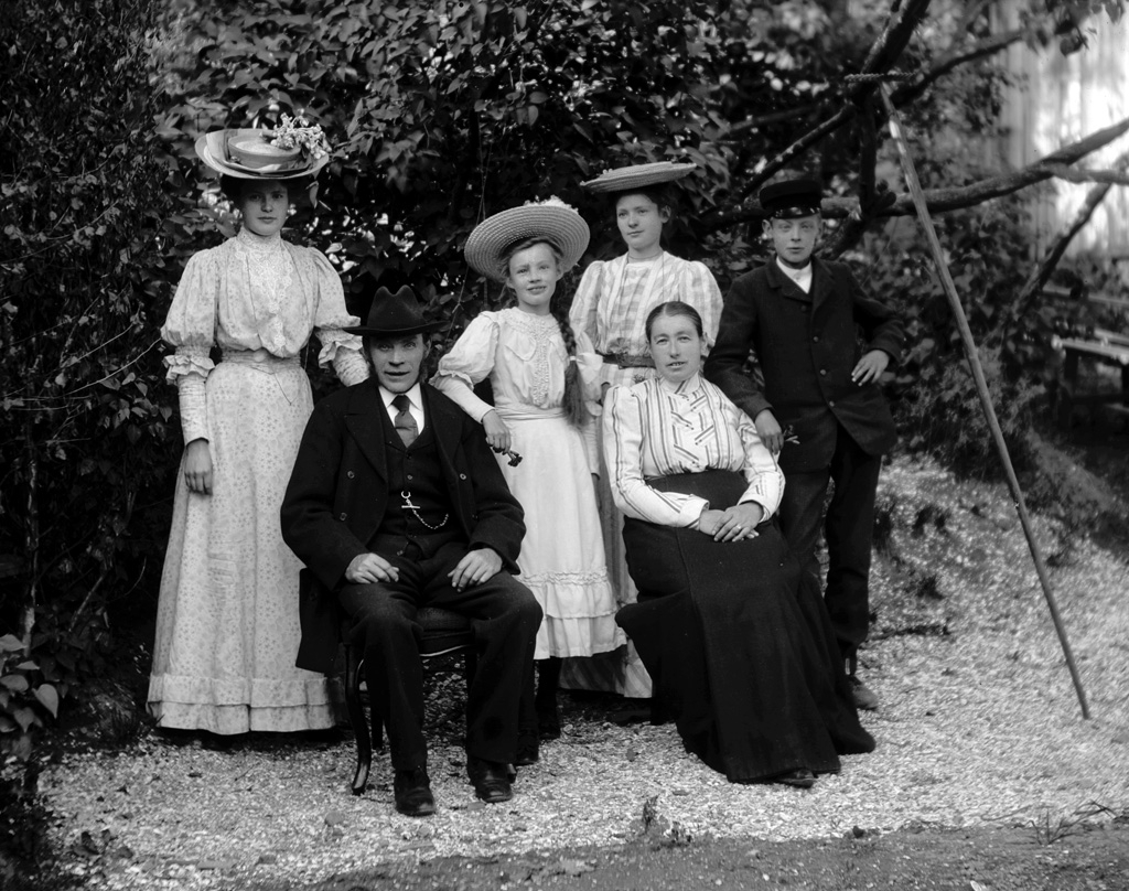 Text till bilden:" Porträttgrupp i det fria. Trädgården, Fossum".