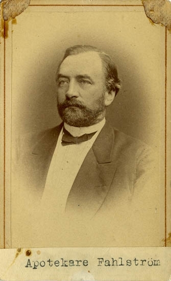 Text på kortets baksida: "Apotekaren Adolf Fredrik Fahlström. Född 1829 död 1879".