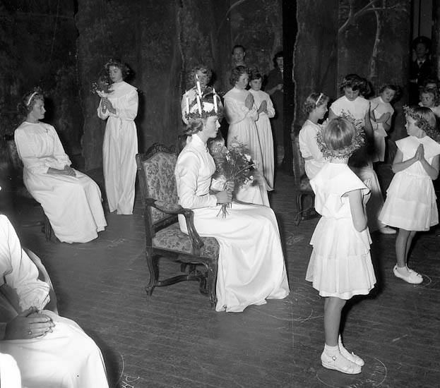 Enligt notering: "Kröning av U-a Lucia 1955 17 åriga Gulli Ljungquist från Gravarne 13-12-1955".