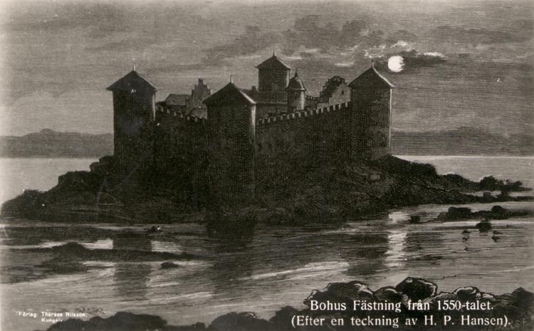 Tryckt text på kortet: "Bohus Fästning från 1550- talet. (Efter en teckning av H. P. Hansen)".