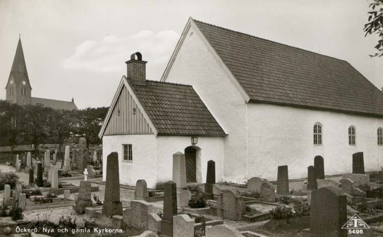 Tryckt text på kortet: "Öckerö. Nya och gamla Kyrkorna."