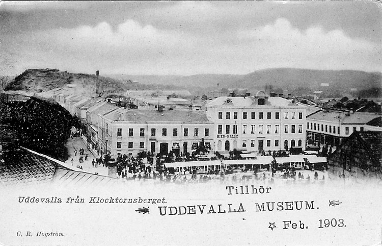 Tryckt text på vykortets framsida: "Uddevalla från Klocktornsberget".