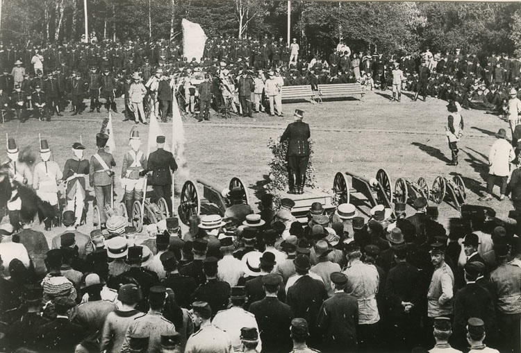 Titel: Enligt Bengt Lundins noteringar: "Kyrkparad med gamla uniformer och kanoner".