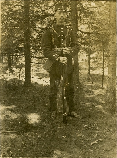 Enligt Bengt Lundins noteringar: "Stridsutrustad Sven Johansson, poserar i skog".