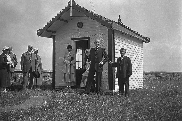 Kammarherre von Platen, prinsessan Ingeborg, prins Carl och Thure Bonander med okända damer vid tennispaviljongen "Troja"