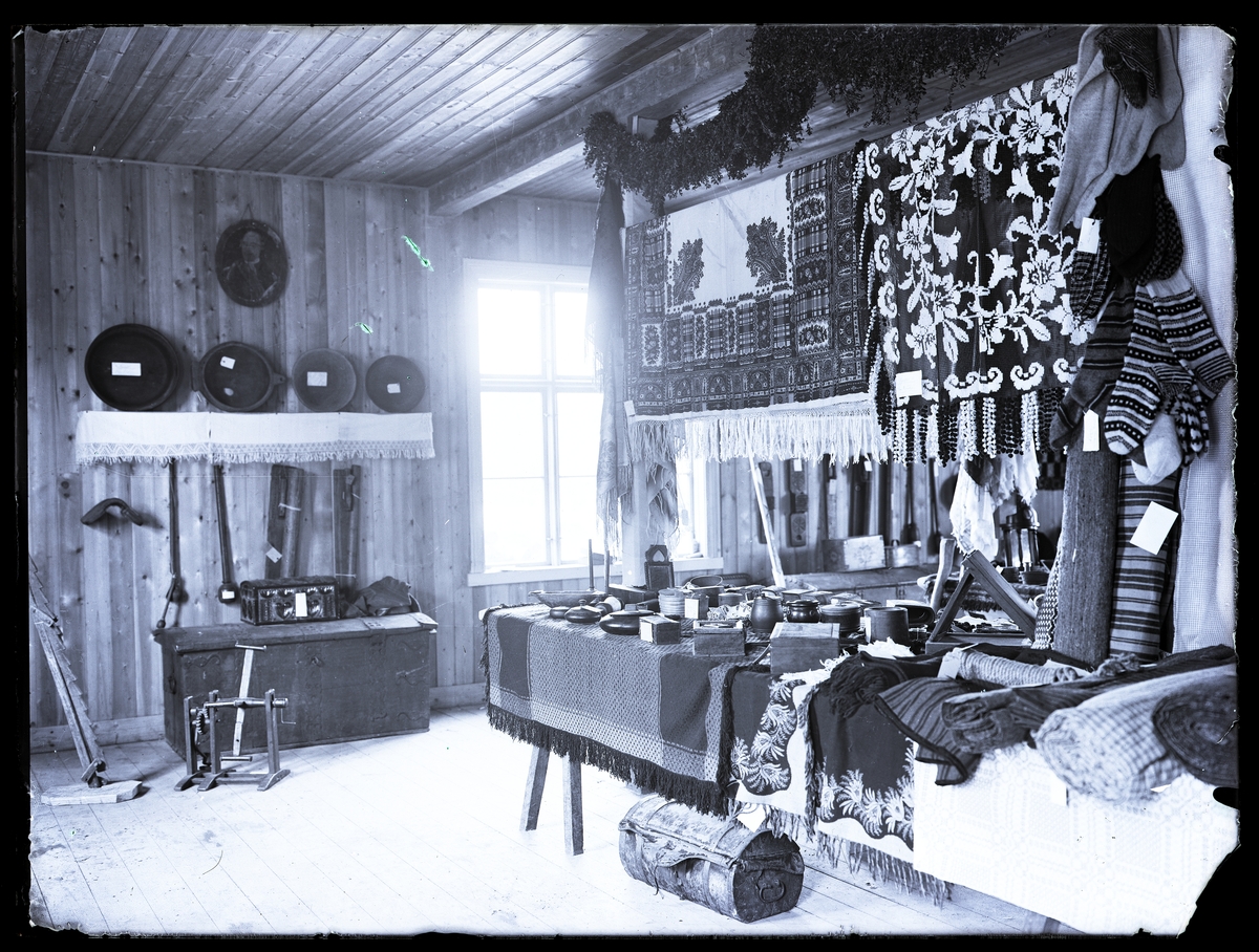 Enligt fotografens noteringar: "Utställning af slöjdsaker i Munkedal omkring år 1916. Initiativ af Häradskrifvare Kleberg & Doktor K. Sundberg."