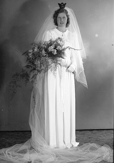 Enligt fotografens journal nr 7 1944-1950: "Törnfeldt - Morén, Halmstad bruden".