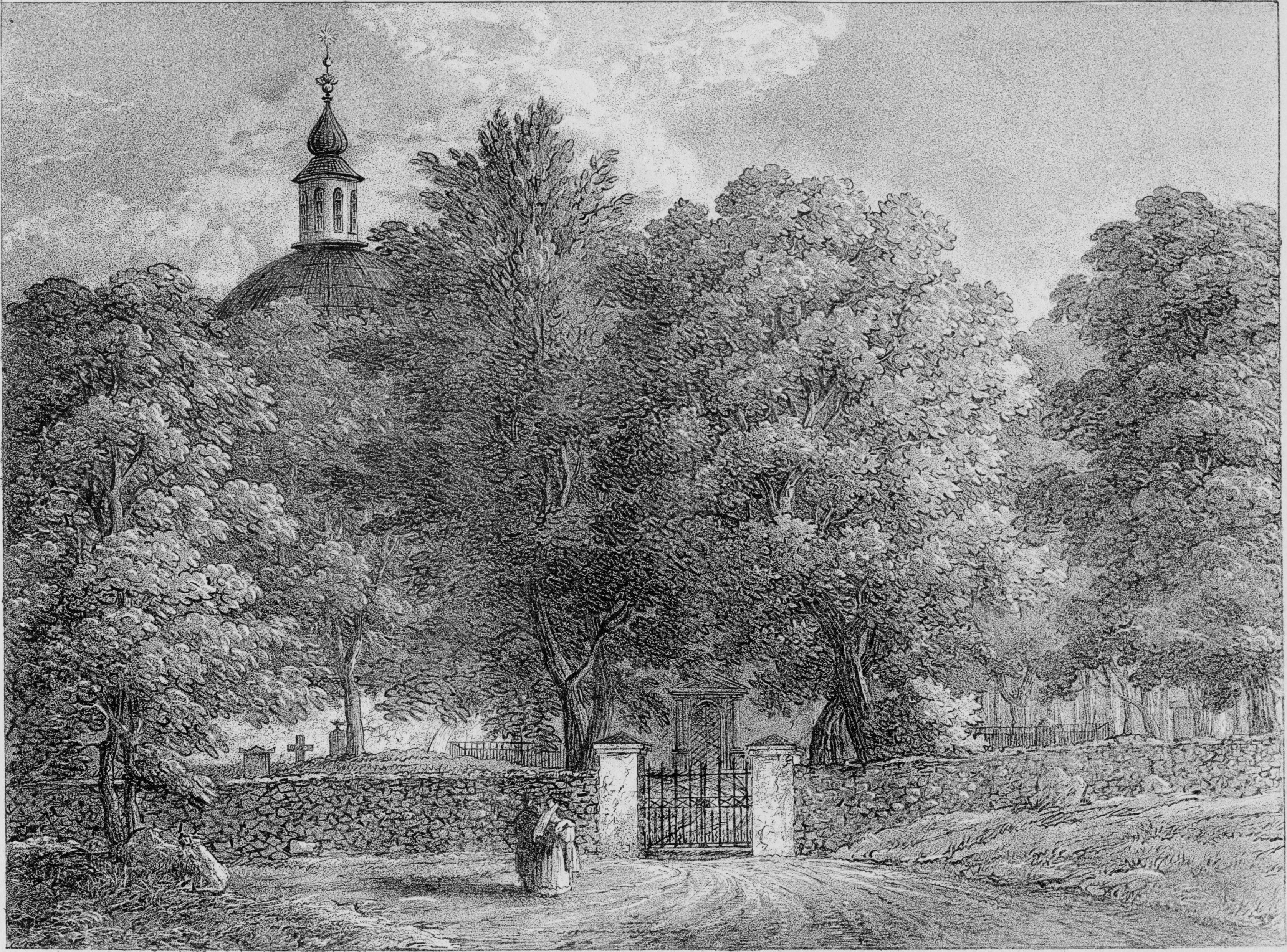 Ingång till kyrkogården mot väster. Tryck av J.F. Julin.