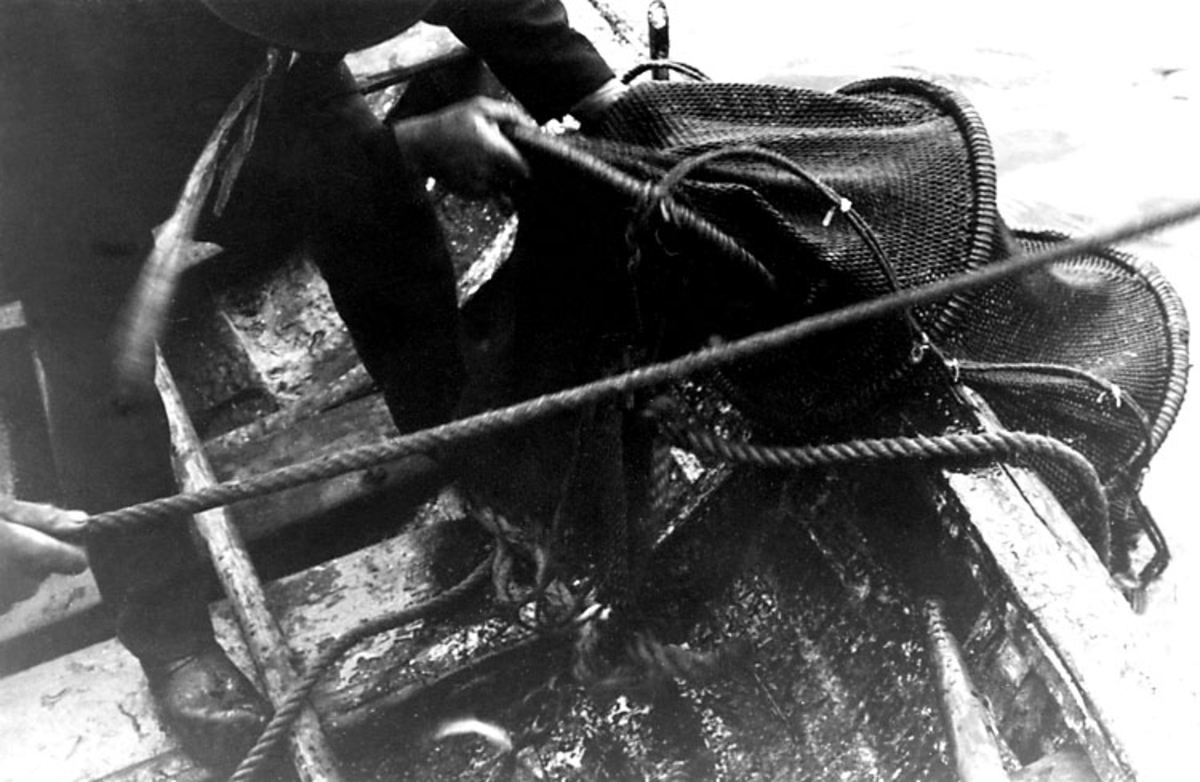 Skrivet på baksidan: Blekinge, Listers hd, Mjällby sn, Hörvik. Bottengarn. Struten är öppen och fångsten - en sill - faller ut.