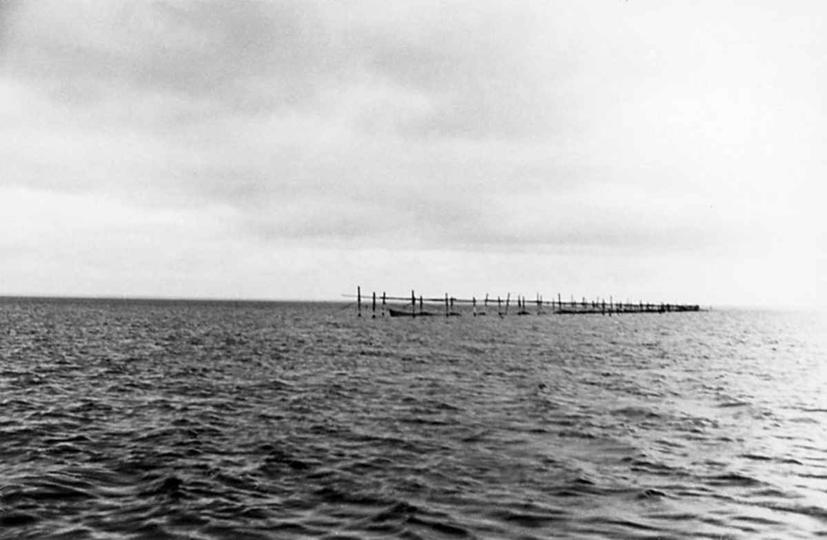 Skrivet på baksidan: Blekinge, Listers hd, Mjällby sn, Hörvik. Bottengarnet på "fisket". Fiskena ha olika namn, t.ex. Kodden, rävörat. m.fl.